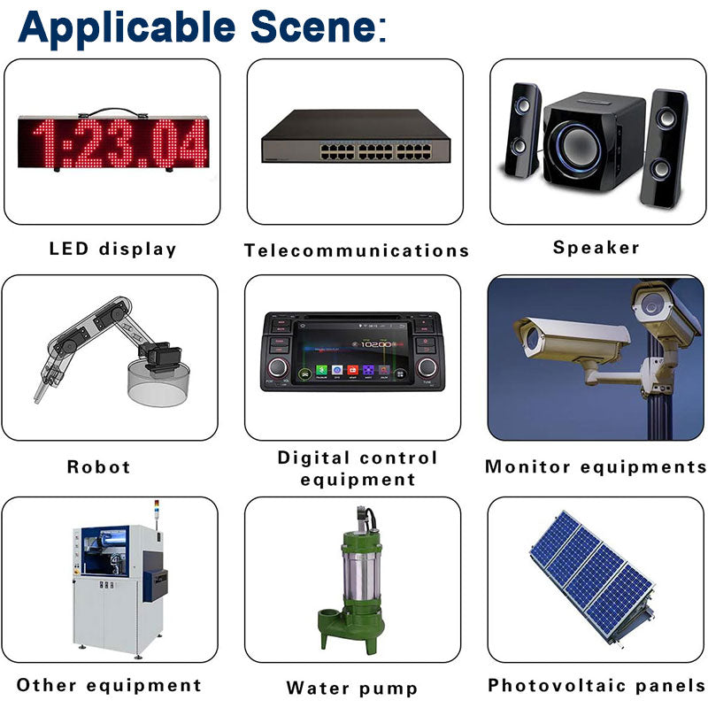 - Adopt Synchronous Rectification Technology to improve conversion efficiency, Maximum Efficiency:≥95%; Ripple Wave: 50Mv; Starting delay time:≤2S